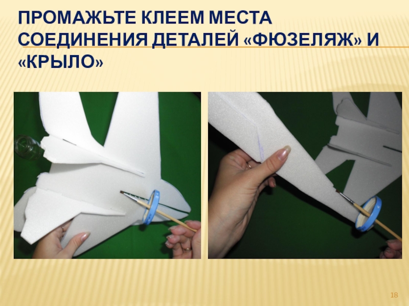 Слайд 18Промажьте клеем места соединения деталей «фюзеляж» и «крыло»
