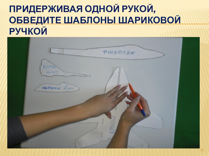 Слайд 9Придерживая одной рукой, обведите шаблоны шариковой ручкой