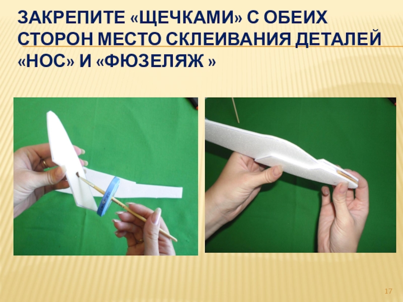 Слайд 17закрепите «щечками» с обеих сторон место склеивания деталей «нос» и «фюзеляж
