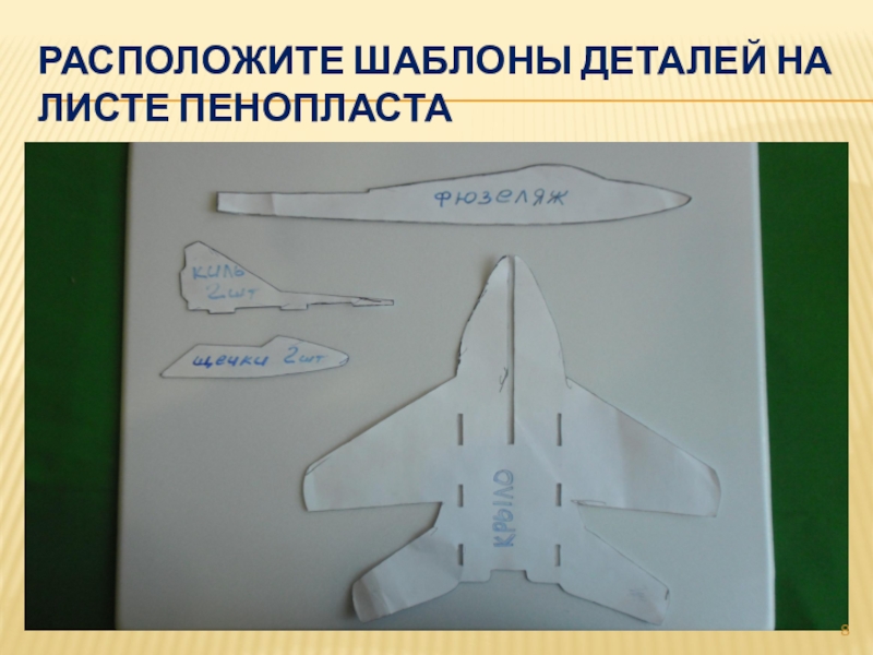 Слайд 8Расположите шаблоны деталей на листе пенопласта