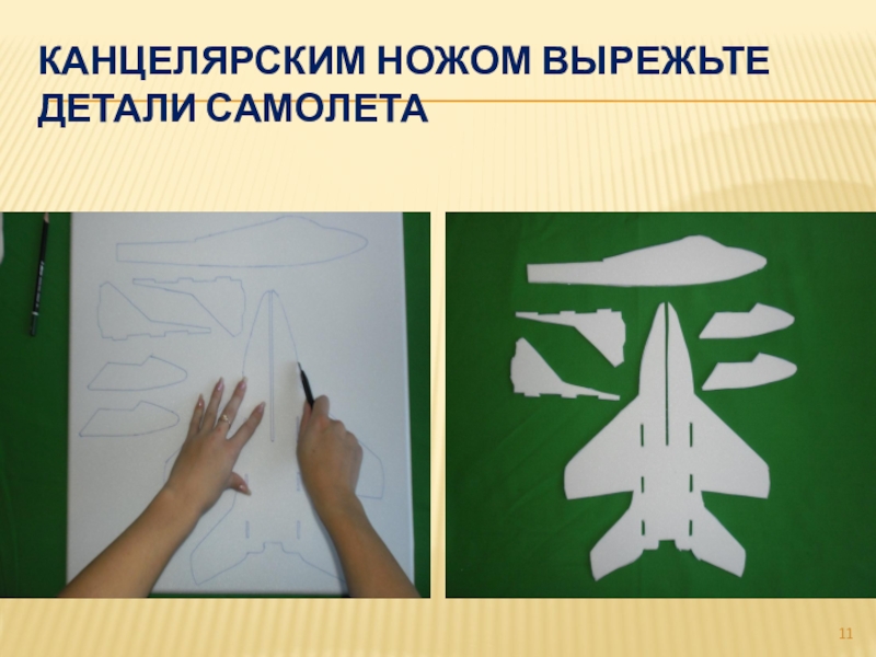 Слайд 11Канцелярским ножом вырежьте детали самолета