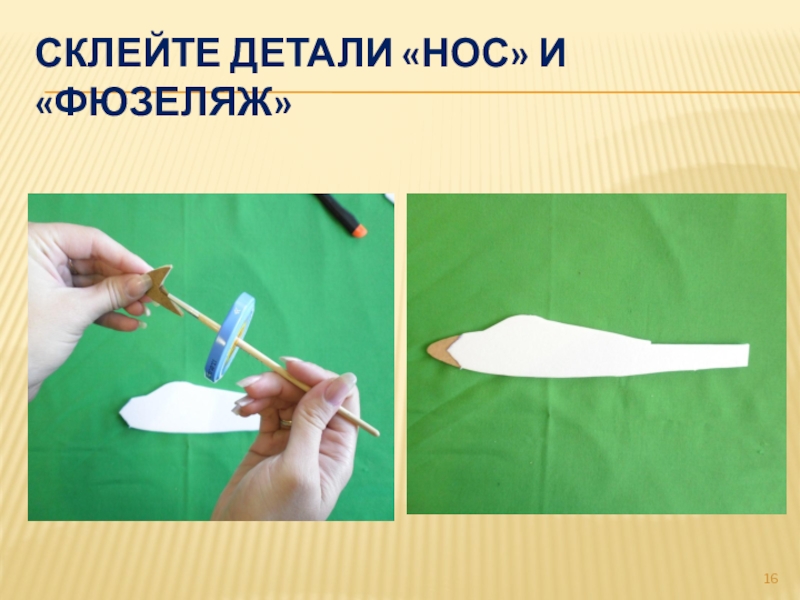 Слайд 16Склейте детали «нос» и «фюзеляж»