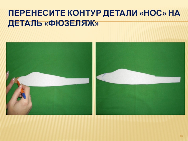 Слайд 14Перенесите контур детали «нос» на деталь «фюзеляж»