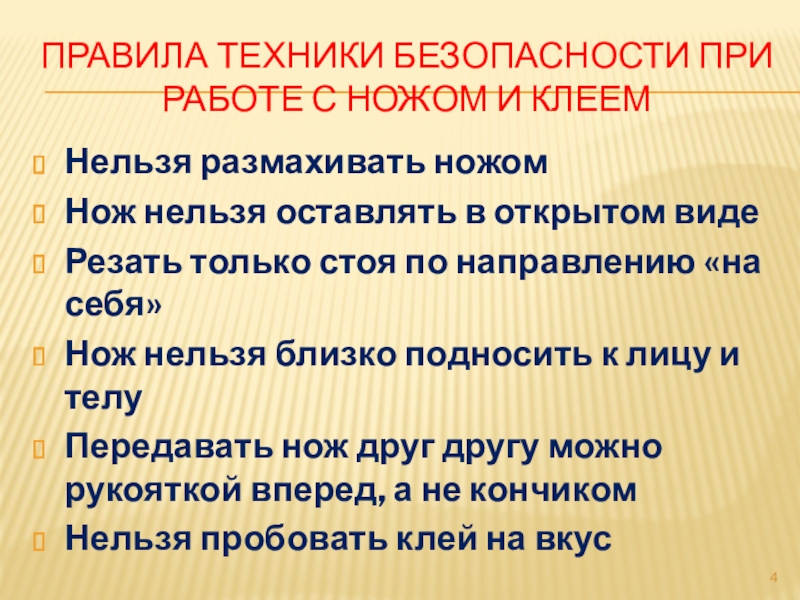 Слайд 4Правила техники безопасности при работе с ножом и клеем