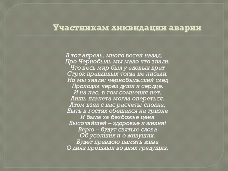 Участникам ликвидации аварииВ тот апрель, много весен назад, Про Чернобыль мы мало что знали. Что весь