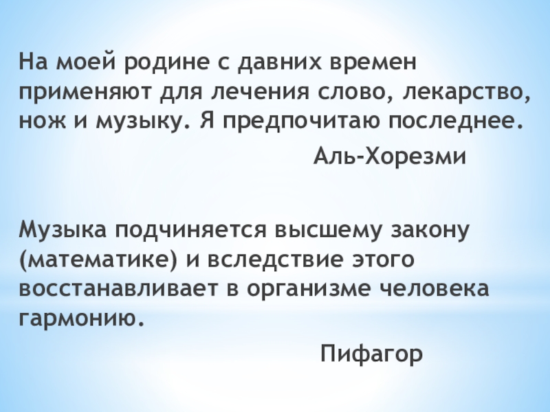Музыка подчиняется высшему закону (математике) и вследствие этого восстанавливает в организме человека гармонию.