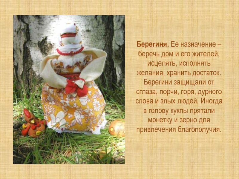 Слайд 8Берегиня. Ее назначение – беречь дом и его жителей, исцелять, исполнять