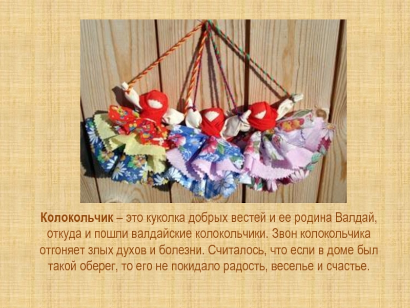 Слайд 14Колокольчик – это куколка добрых вестей и ее родина Валдай, откуда