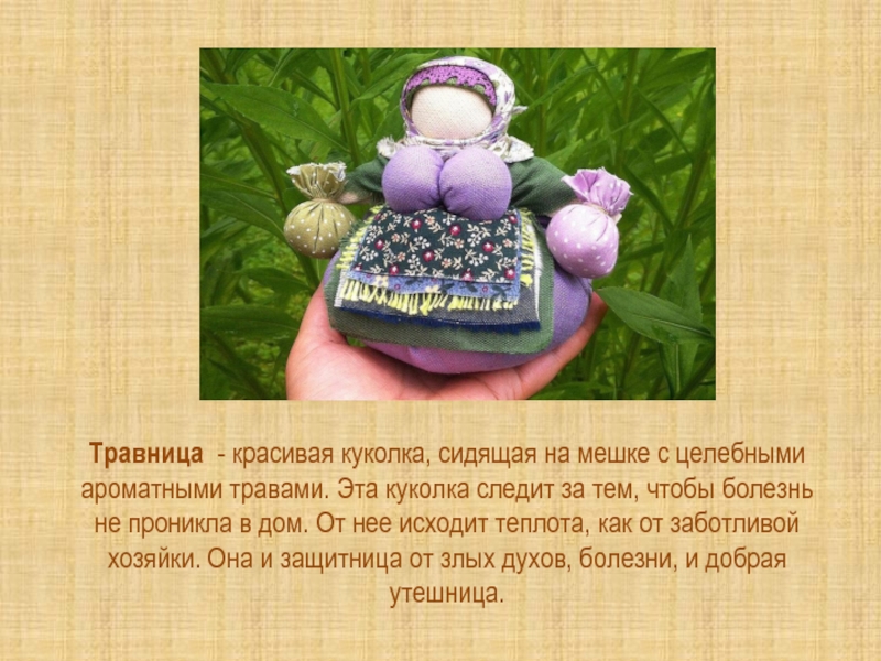 Слайд 9Травница - красивая куколка, сидящая на мешке с целебными ароматными травами.