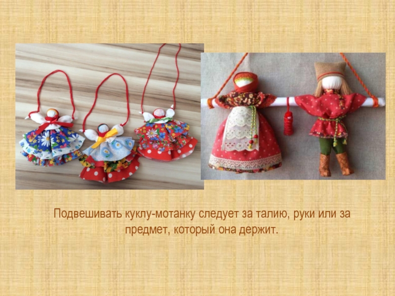 Слайд 16Подвешивать куклу-мотанку следует за талию, руки или за предмет, который она