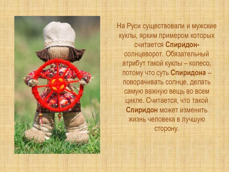Слайд 13На Руси существовали и мужские куклы, ярким примером которых считается Спиридон-солнцеворот.