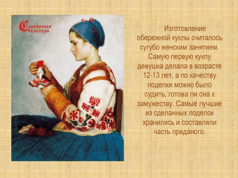 Слайд 3 Изготовление обережной куклы считалось сугубо женским занятием. Самую