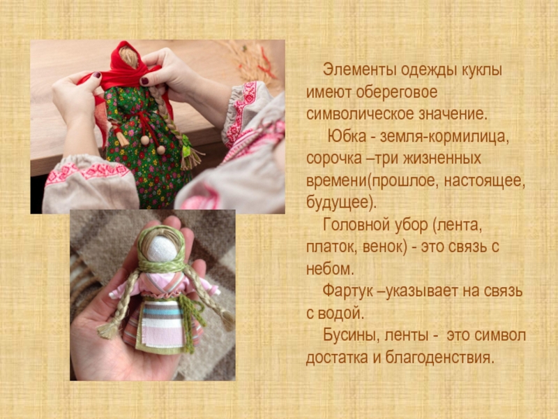 Слайд 4 Элементы одежды куклы имеют обереговое символическое значение.
