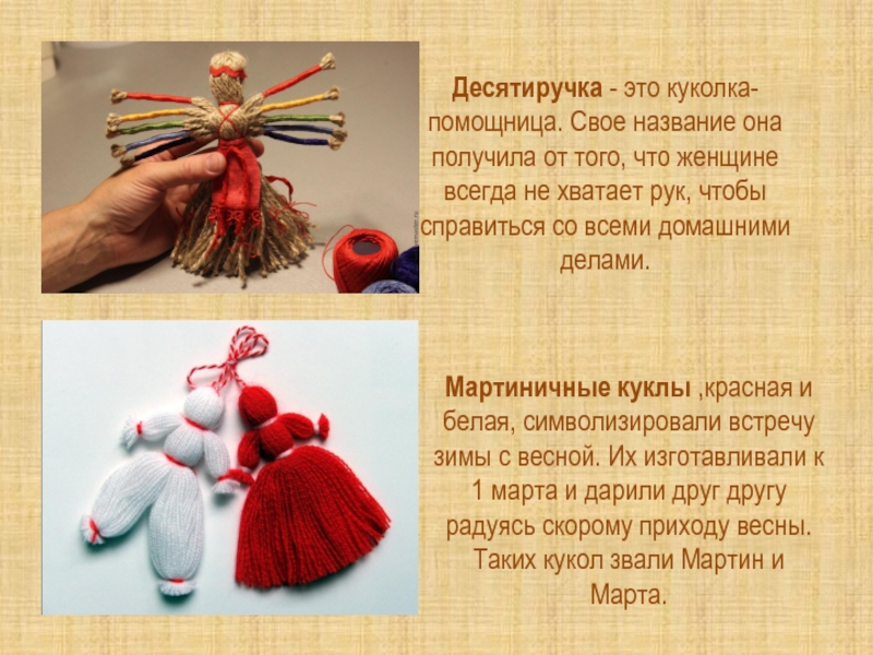 Слайд 11Десятиручка - это куколка-помощница. Свое название она получила от того, что