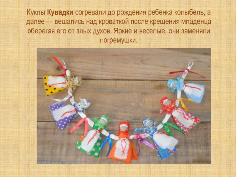 Слайд 6Куклы Кувадки согревали до рождения ребенка колыбель, а далее — вешались