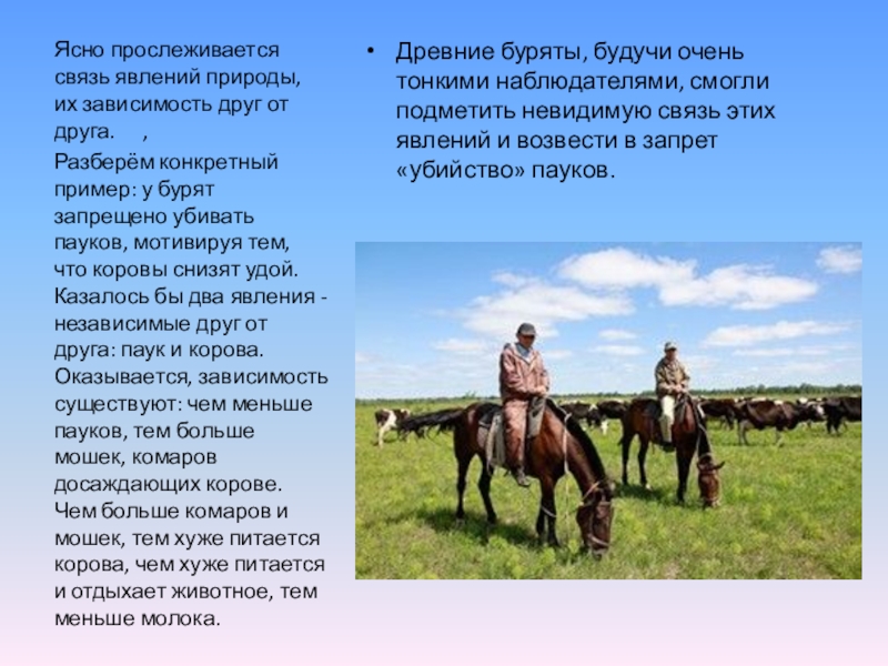 Разберём конкретный пример: у бурят запрещено убивать пауков, мотивируя тем, что коровы снизят удой. Казалось бы два явления - независимые друг от друга: паук и корова. Оказывается, зависимость существуют: чем меньше пауков, тем больше мошек, комаров досаждающих корове. Чем больше комаров и мошек, тем хуже питается корова, чем хуже питается и отдыхает животное, тем меньше молока.