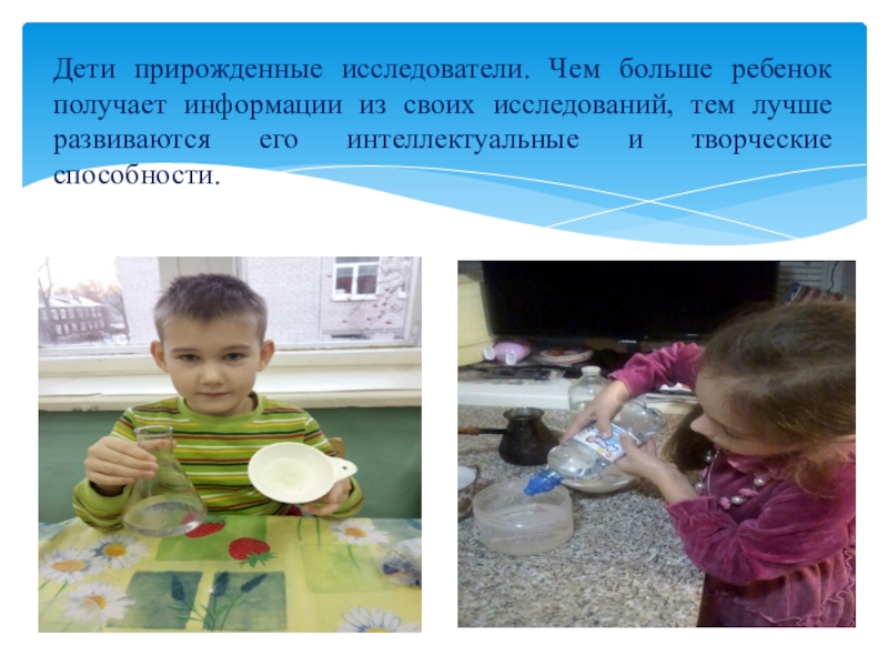 Слайд 2Дети прирожденные исследователи. Чем больше ребенок получает информации из своих исследований,
