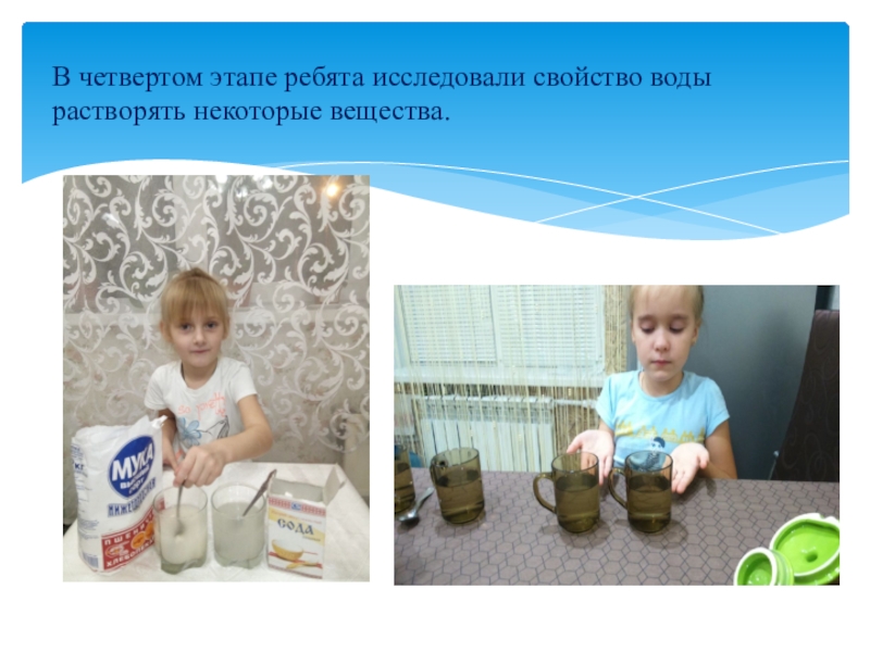 Слайд 13В четвертом этапе ребята исследовали свойство воды растворять некоторые вещества.