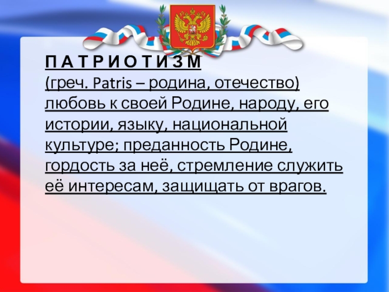 любовь к своей Родине, народу, его истории, языку, национальной культуре; преданность Родине, гордость за неё, стремление служить её интересам, защищать от врагов.