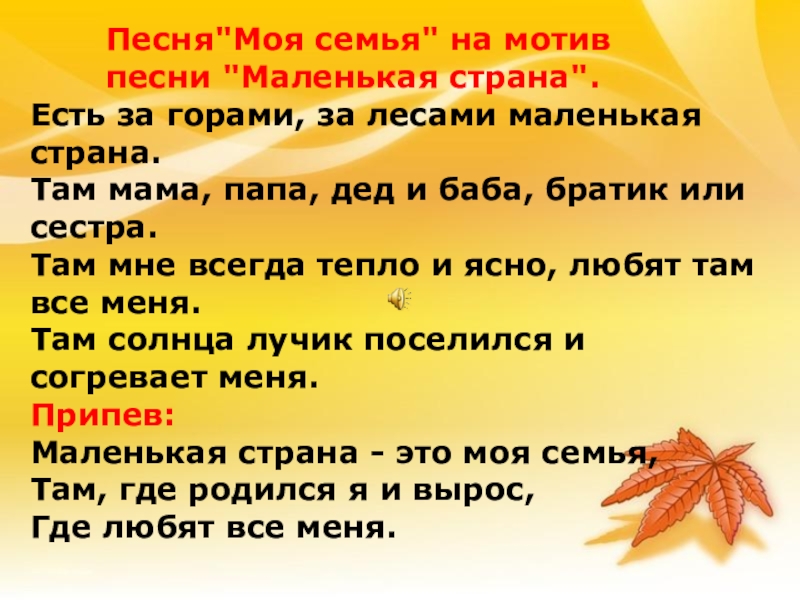 Слайд 41Песня"Моя семья" на мотив песни "Маленькая страна".