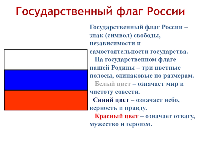 На государственном флаге нашей Родины – три цветные полосы, одинаковые по размерам.