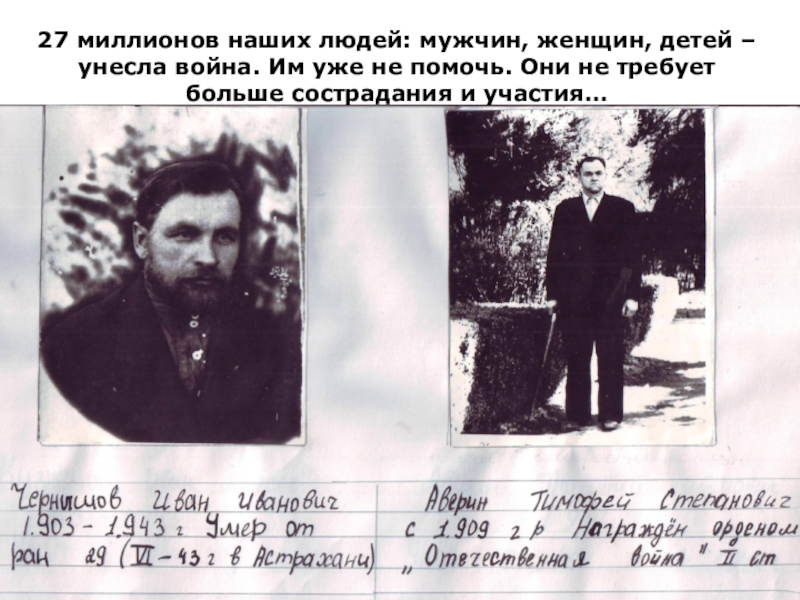 Слайд 1327 миллионов наших людей: мужчин, женщин, детей – унесла война. Им