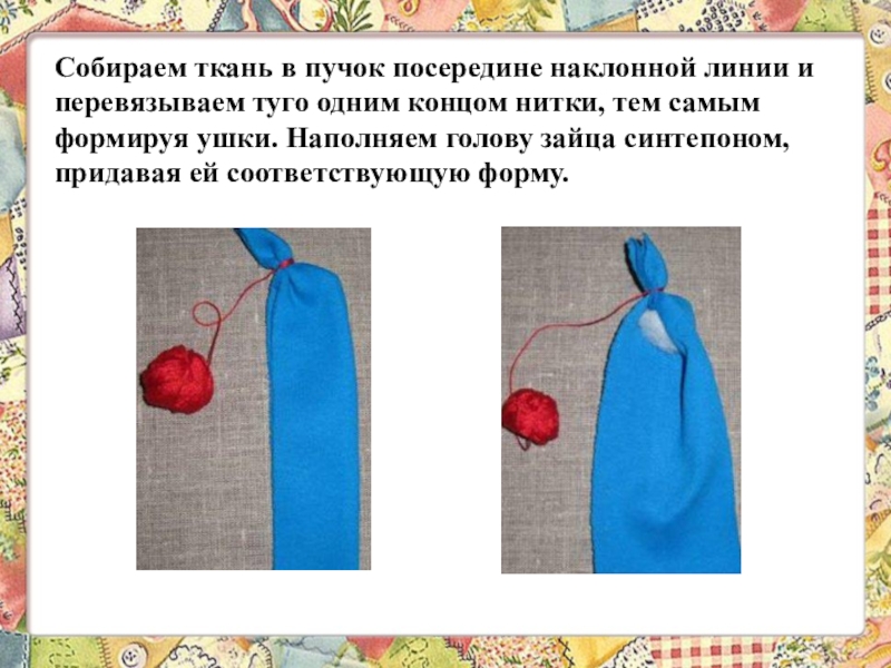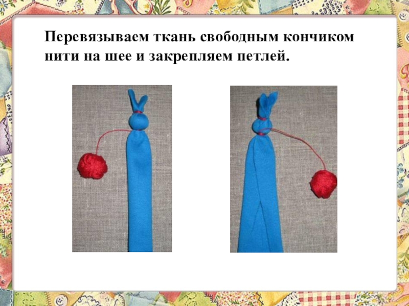 Слайд 7Перевязываем ткань свободным кончиком нити на шее и закрепляем петлей.
