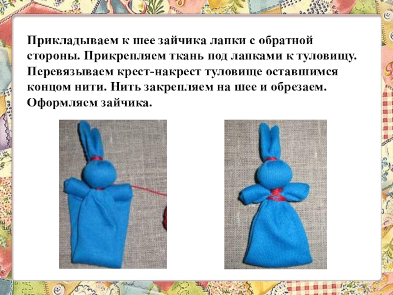 Слайд 8Прикладываем к шее зайчика лапки с обратной стороны. Прикрепляем ткань под