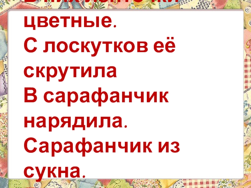 Слайд 2Волосы льняные, В них ленточки цветные. С лоскутков её скрутила В сарафанчик нарядила. Сарафанчик из