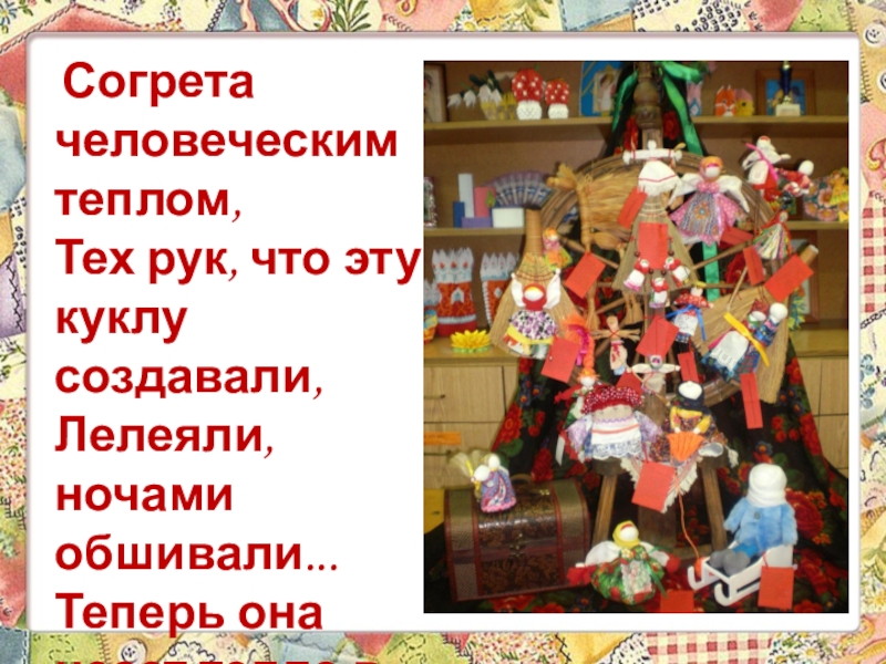 Слайд 9 Согрета человеческим теплом, Тех рук, что эту куклу создавали, Лелеяли, ночами обшивали... Теперь
