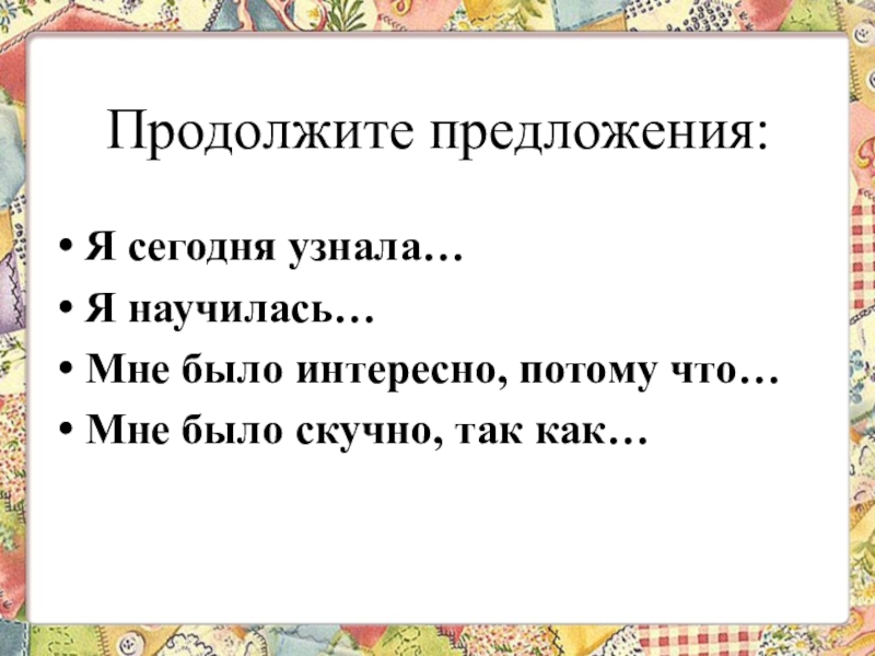 Продолжите предложения:Я сегодня узнала…Я научилась…Мне было интересно, потому что…Мне было скучно, так как…