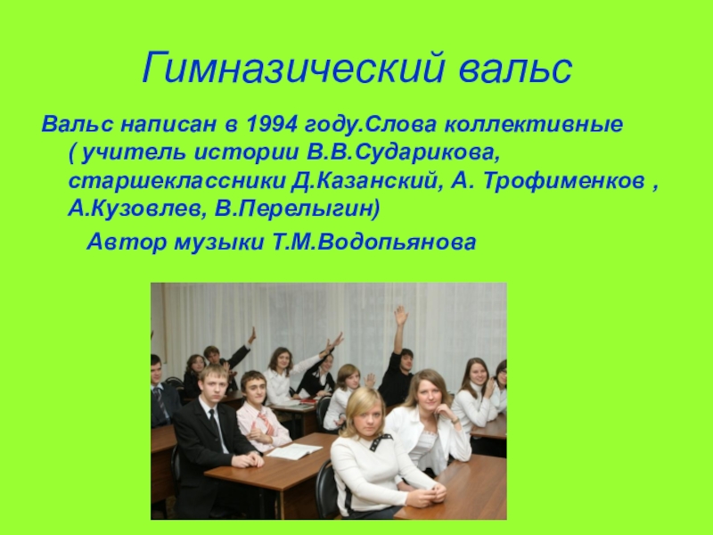Гимназический вальсВальс написан в 1994 году.Слова коллективные    ( учитель истории В.В.Сударикова, старшеклассники Д.Казанский, А.