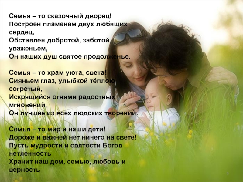Слайд 9Семья – то сказочный дворец! Построен пламенем двух любящих сердец, Обставлен