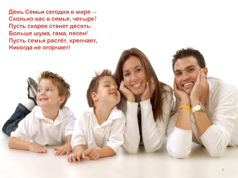 Слайд 5День Семьи сегодня в мире — Сколько вас в семье, четыре? Пусть скорее