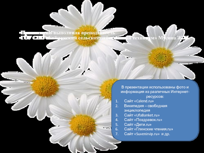 В презентации использованы фото и информация из различных Интернет-ресурсов:Сайт «Calend.ru»Википедия – свободная энциклопедияСайт «UfaBanket.ru»Сайт «Поздравок.ru»Сайт «Дети.ru»Сайт «Глинские