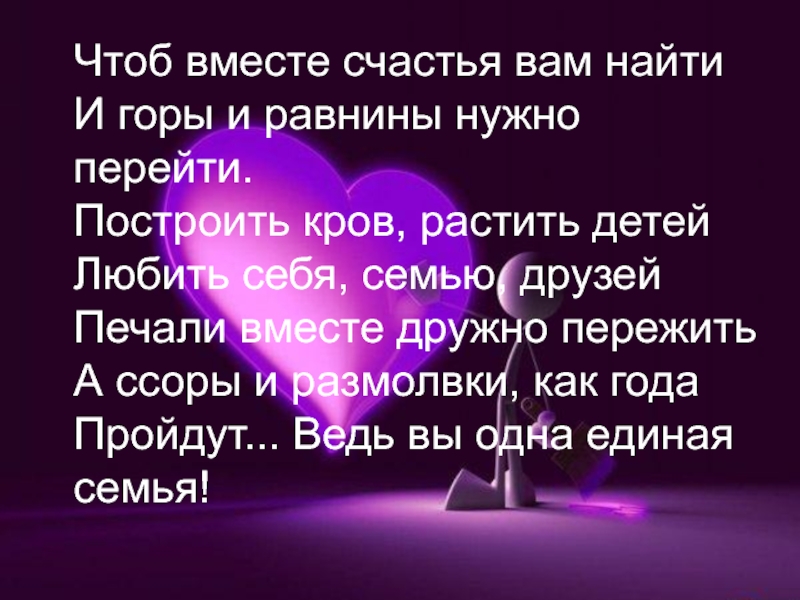 Чтоб вместе счастья вам найтиИ горы и равнины нужно перейти. Построить кров, растить детей Любить себя, семью,