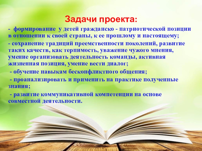 Задачи проекта:- формирование у детей гражданско - патриотической позиции в отношении к своей страны, к ее прошлому
