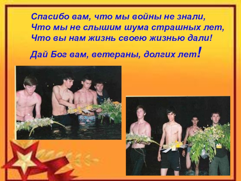 Слайд 21Спасибо вам, что мы войны не знали, Что мы не слышим шума