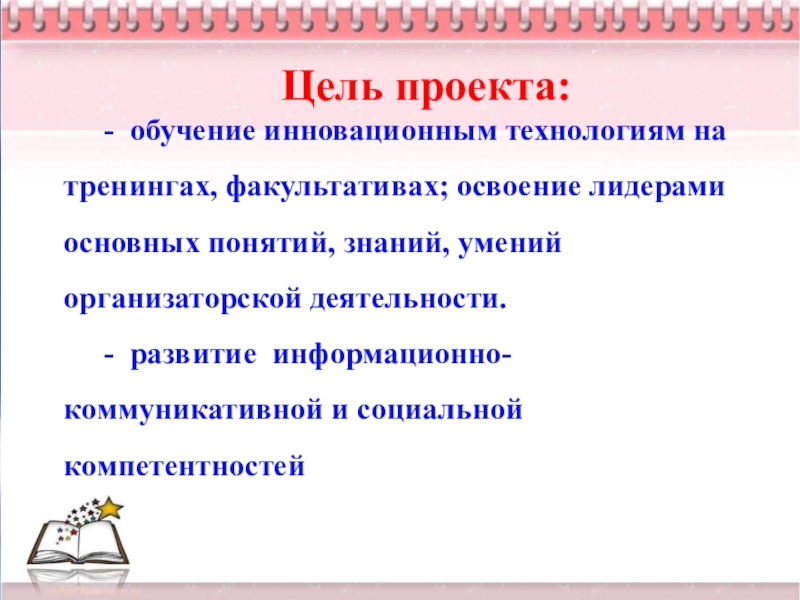 Цель проекта:- обучение инновационным технологиям на тренингах, факультативах; освоение лидерами основных понятий, знаний, умений организаторской деятельности. -