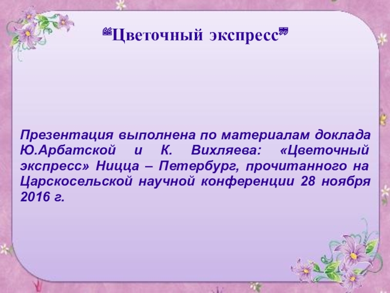 Презентация выполнена по материалам доклада Ю.Арбатской и К. Вихляева: «Цветочный