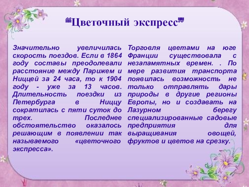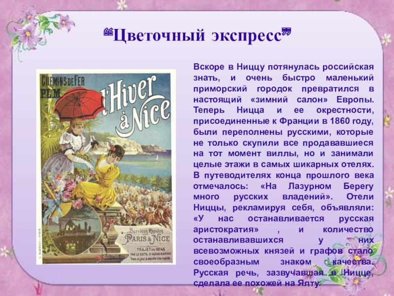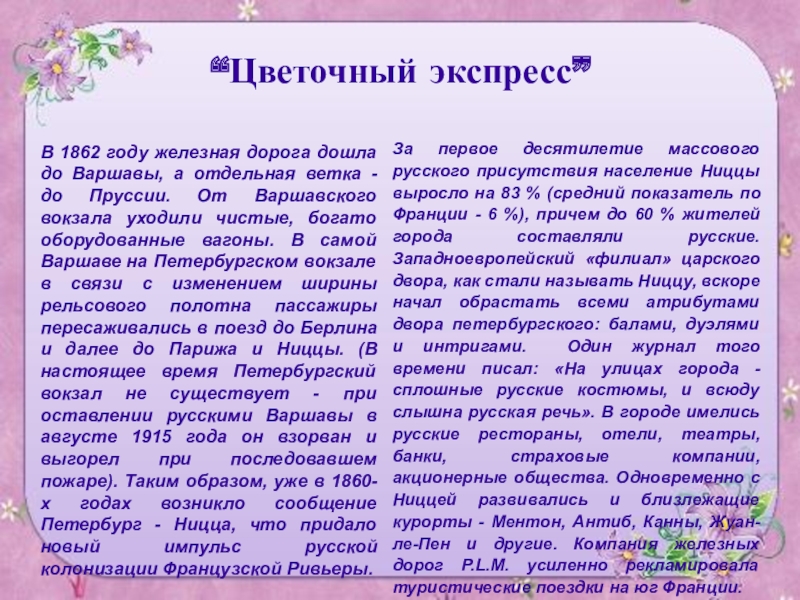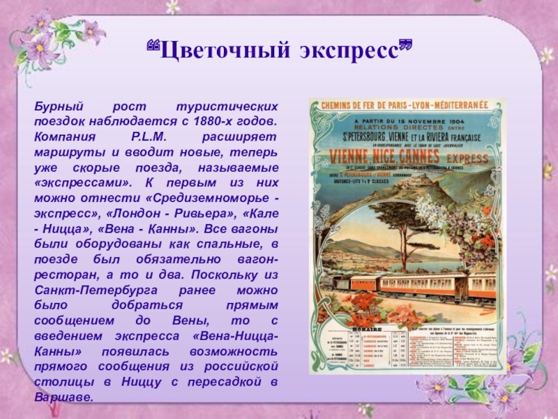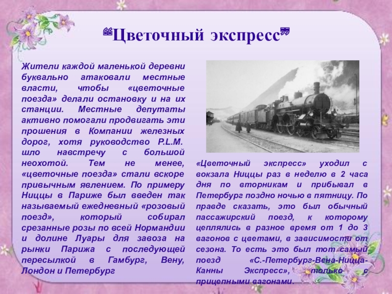 расстояние между Парижем и Ниццей за 24 часа, то к 1904 году - уже за 13 часов. Длительность поездки из Петербурга в Ниццу сократилась с пяти суток до трех. Последнее обстоятельство оказалось решающим в появлении так называемого «цветочного экспресса».