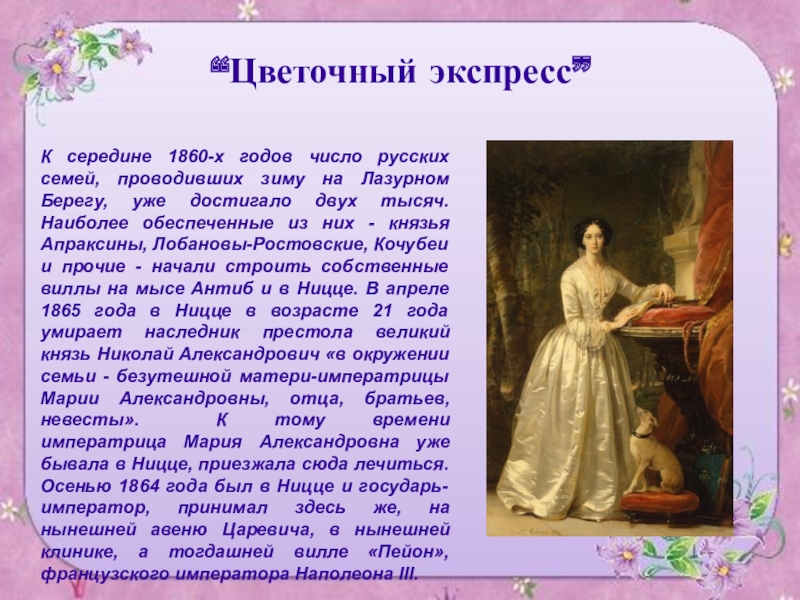 Лазурном Берегу, уже достигало двух тысяч. Наиболее обеспеченные из них - князья Апраксины, Лобановы-Ростовские, Кочубеи и прочие - начали строить собственные виллы на мысе Антиб и в Ницце. В апреле 1865 года в Ницце в возрасте 21 года умирает наследник престола великий князь Николай Александрович «в окружении семьи - безутешной матери-императрицы Марии Александровны, отца, братьев, невесты». К тому времени императрица Мария Александровна уже бывала в Ницце, приезжала сюда лечиться. Осенью 1864 года был в Ницце и государь-император, принимал здесь же, на нынешней авеню Царевича, в нынешней клинике, а тогдашней вилле «Пейон», французского императора Наполеона III.