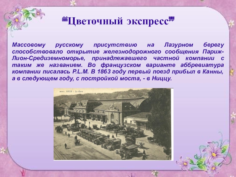 Слайд 5Массовому русскому присутствию на Лазурном берегу способствовало открытие железнодорожного сообщения Париж-Лион-Средиземноморье,