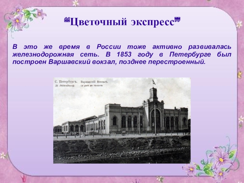сеть. В 1853 году в Петербурге был построен Варшавский вокзал, позднее перестроенный.