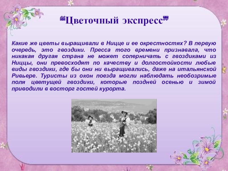 очередь, это гвоздики. Пресса того времени признавала, что никакая другая страна не может соперничать с гвоздиками из Ниццы, они превосходят по качеству и долгостойкости любые виды гвоздики, где бы они ни выращивались, даже на итальянской Ривьере. Туристы из окон поезда могли наблюдать необозримые поля цветущей гвоздики, которые поздней осенью и зимой приводили в восторг гостей курорта.