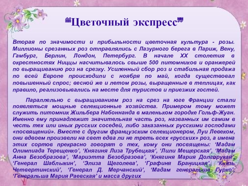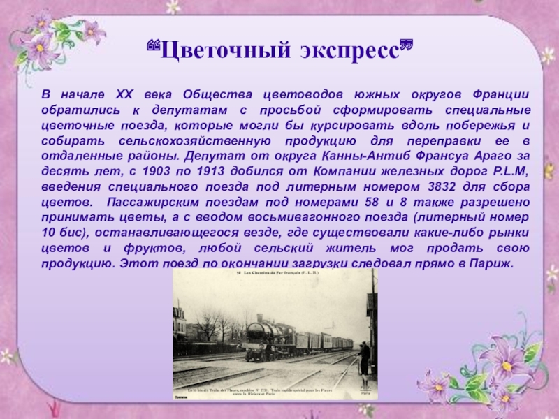 делали остановку и на их станции. Местные депутаты активно помогали продвигать эти прошения в Компании железных дорог, хотя руководство P.L.M. шло навстречу с большой неохотой. Тем не менее, «цветочные поезда» стали вскоре привычным явлением. По примеру Ниццы в Париже был введен так называемый ежедневный «розовый поезд», который собирал срезанные розы по всей Нормандии и долине Луары для завоза на рынки Парижа с последующей пересылкой в Гамбург, Вену, Лондон и Петербург
