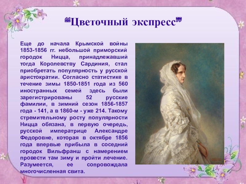 Ницца, принадлежавший тогда Королевству Сардиния, стал приобретать популярность у русской аристократии. Согласно статистике в течение зимы 1850-1851 года из 560 иностранных семей здесь были зарегистрированы 52 русские фамилии, в зимний сезон 1856-1857 года - 141, а в 1860-м - уже 214. Такому стремительному росту популярности Ницца обязана, в первую очередь, русской императрице Александре Федоровне, которая в октябре 1856 года впервые прибыла в соседний городок Вильфранш с намерением провести там зиму и пройти лечение. Разумеется, ее сопровождала многочисленная свита.