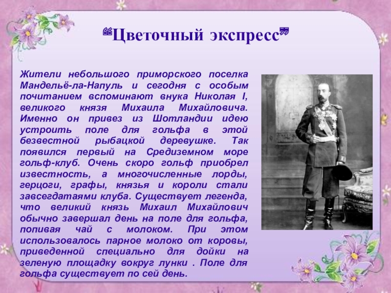 вспоминают внука Николая I, великого князя Михаила Михайловича. Именно он привез из Шотландии идею устроить поле для гольфа в этой безвестной рыбацкой деревушке. Так появился первый на Средиземном море гольф-клуб. Очень скоро гольф приобрел известность, а многочисленные лорды, герцоги, графы, князья и короли стали завсегдатаями клуба. Существует легенда, что великий князь Михаил Михайлович обычно завершал день на поле для гольфа, попивая чай с молоком. При этом использовалось парное молоко от коровы, приведенной специально для дойки на зеленую площадку вокруг лунки . Поле для гольфа существует по сей день.