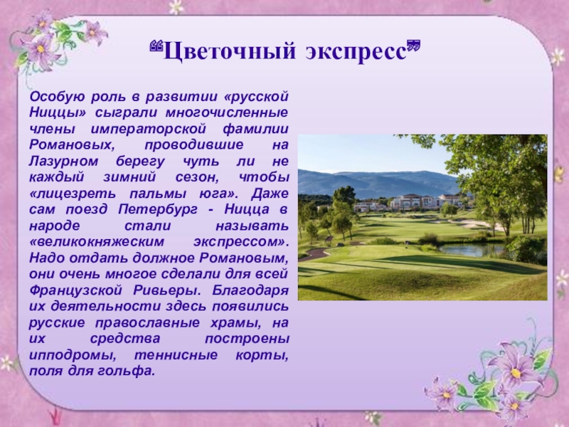 фамилии Романовых, проводившие на Лазурном берегу чуть ли не каждый зимний сезон, чтобы «лицезреть пальмы юга». Даже сам поезд Петербург - Ницца в народе стали называть «великокняжеским экспрессом». Надо отдать должное Романовым, они очень многое сделали для всей Французской Ривьеры. Благодаря их деятельности здесь появились русские православные храмы, на их средства построены ипподромы, теннисные корты, поля для гольфа.