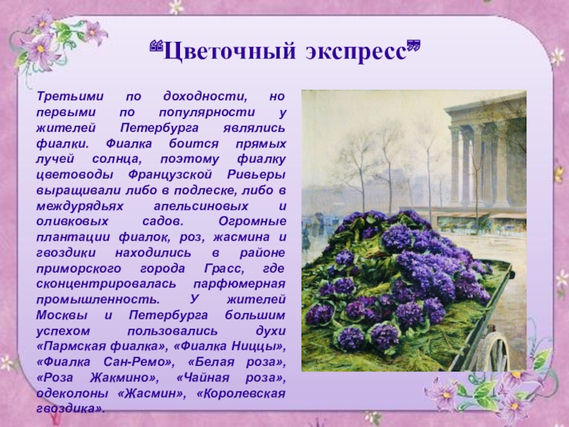 являлись фиалки. Фиалка боится прямых лучей солнца, поэтому фиалку цветоводы Французской Ривьеры выращивали либо в подлеске, либо в междурядьях апельсиновых и оливковых садов. Огромные плантации фиалок, роз, жасмина и гвоздики находились в районе приморского города Грасс, где сконцентрировалась парфюмерная промышленность. У жителей Москвы и Петербурга большим успехом пользовались духи «Пармская фиалка», «Фиалка Ниццы», «Фиалка Сан-Ремо», «Белая роза», «Роза Жакмино», «Чайная роза», одеколоны «Жасмин», «Королевская гвоздика».